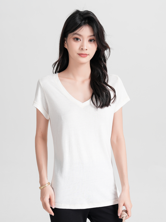 The classic v-neck silhouette and clean white finish of this silk smooth bamboo women's tee make it a universally flattering, endlessly versatile piece. It can be worn alone for casual daily looks, layered under jackets for business casual outfits, paired with jeans for weekend outings, or styled as part of a uniform set. This year-round wearability eliminates seasonal sales limits, ensuring consistent revenue for your business throughout the year.